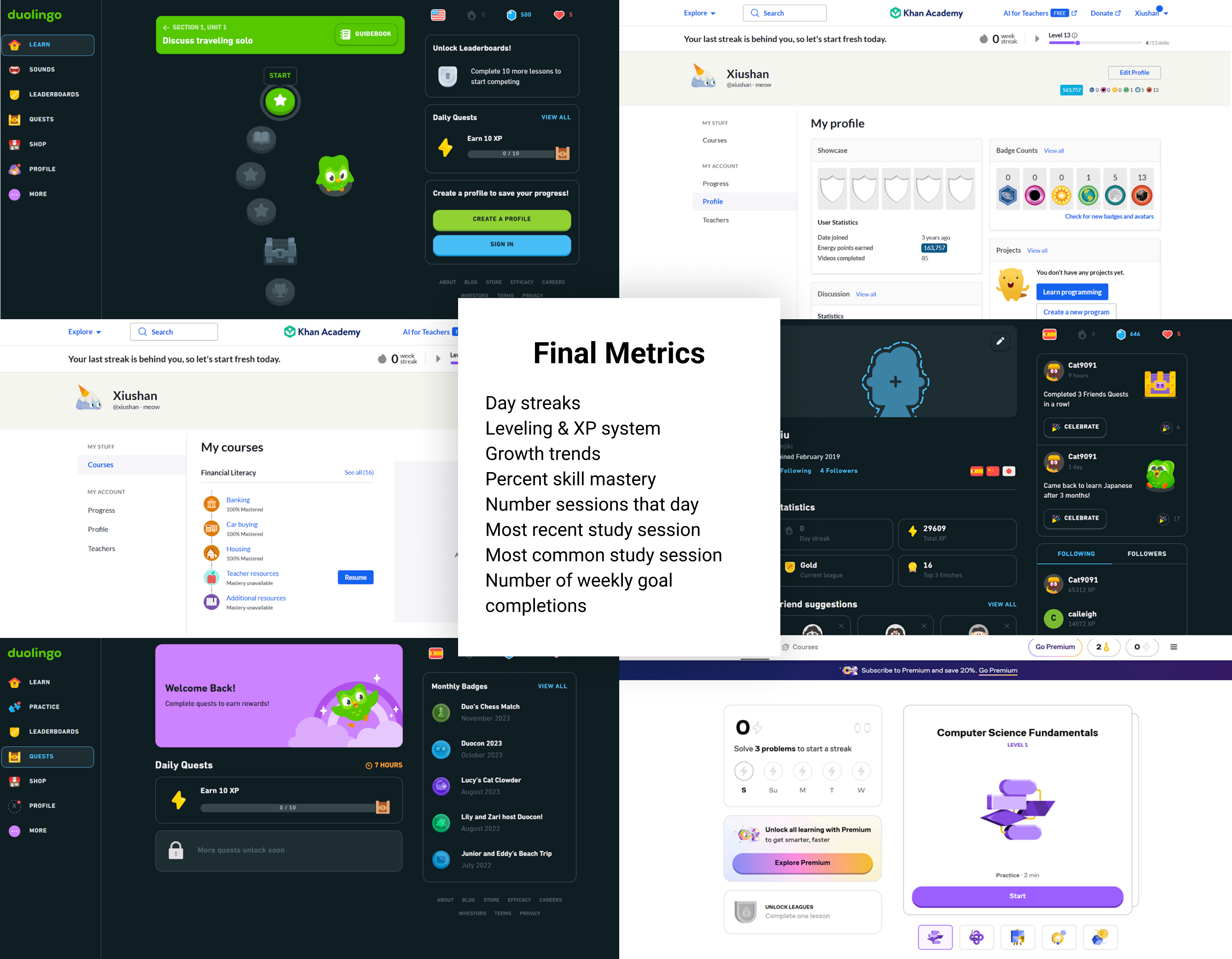 I drew from Duolingo, Khan Academy, and Brilliant to understand how learning platforms motivate users to build habits. Key patterns: streaks, XP systems, progress visualization, and reducing friction to start practicing.