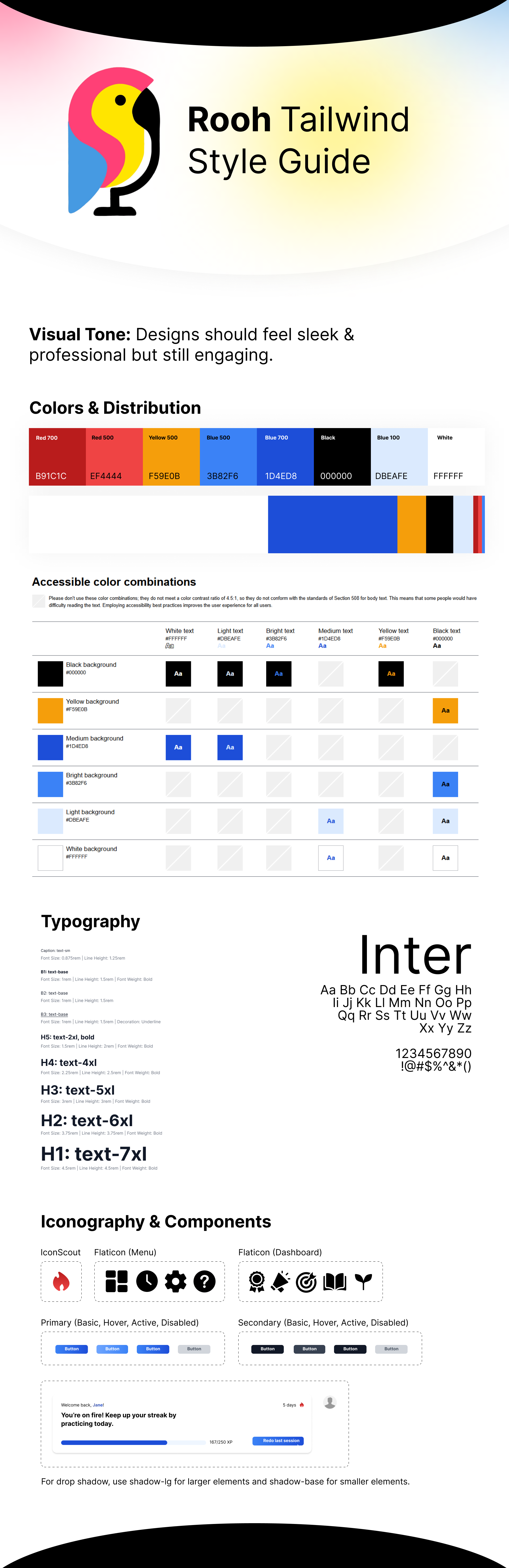 I created a Tailwind-based style guide with accessible color combinations, typography scale, and reusable components (buttons with all states, cards, progress bars).